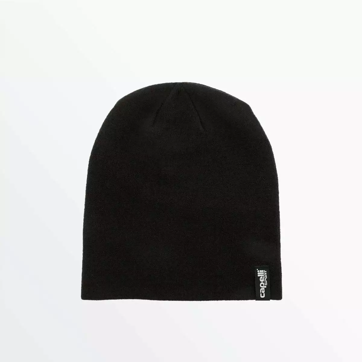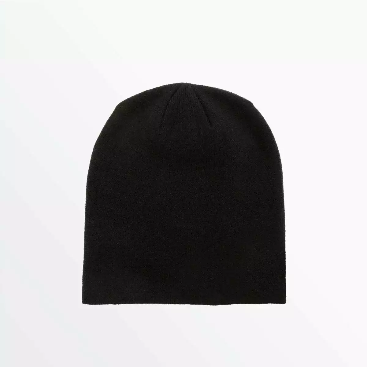 Classic black beanie in soft knit fabric. Stay warm and toasty on the field and off.