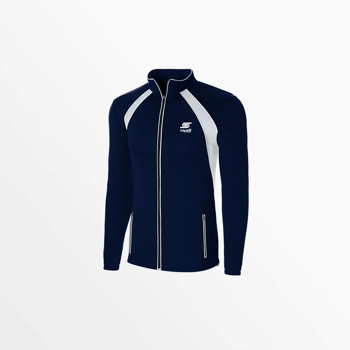 The Raven Training jacket elevates your second layer with new piping details, elastic at the sleeve and bottom openings and mesh panels to keep you cool and dry throughout practice.