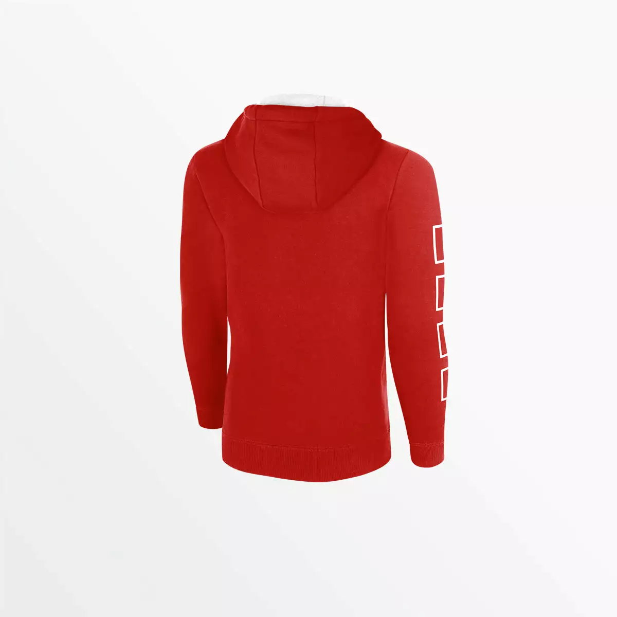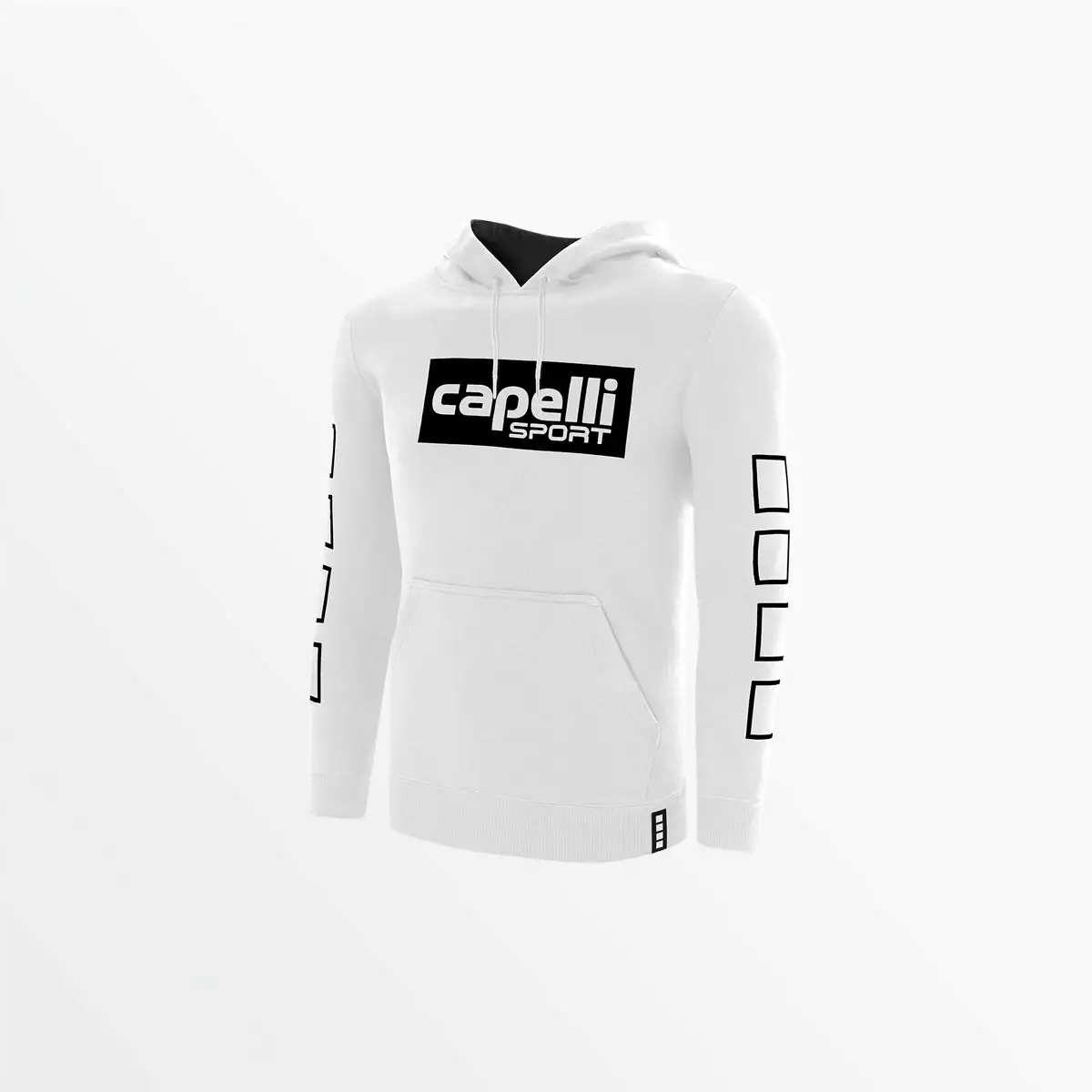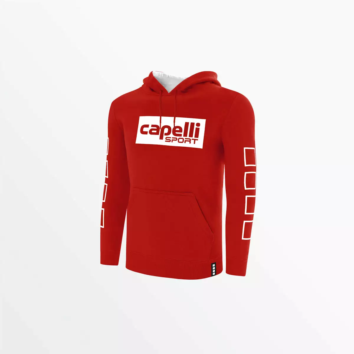 With a soft inner lining, cool 4 cube sleeve design, and a large kangaroo-style pocket, the Capelli Sport Youth Lifestyle Fleece Pullover Hoodie is the perfect combo of comfort, vibe, and function. Ribbed cuffs and a warm hood take this machine-washable sweatshirt to the next level. Incredibly versatile, this youth fleece hoodie is great for the track, the trail, in class, and around town.