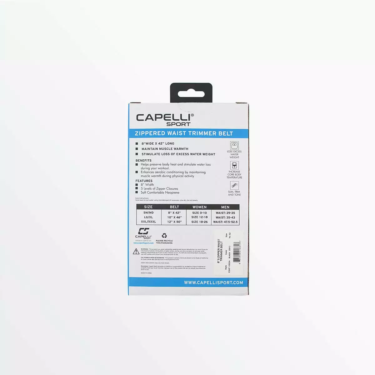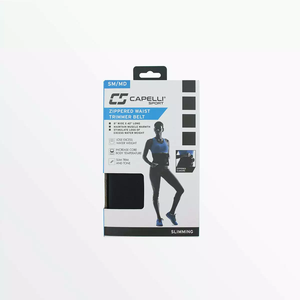 5-level zippered closure allows this waist trimming belt to adjust to your specific comfort level. Capelli Sport waist trimming belts stimulate the loss of extra water weight while keeping your muscles warm and providing core and back support. Double bonded material provides comfort and improves performance.Â