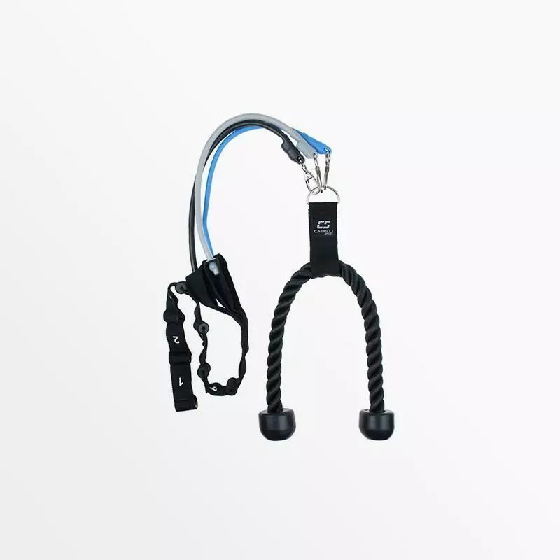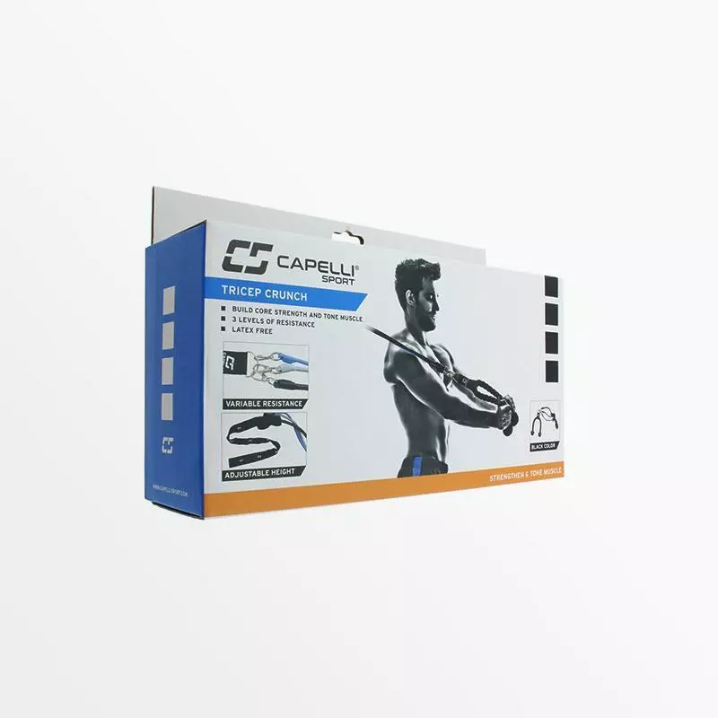 Bring your gym’s cable machine to you with the Capelli Sport Tricep Crunch. Three levels of resistance tubing can be combined or used seperately to let you customize your workout to your personal fitness level. The portable size lets you take your workout anywhere and use the tricep crunch in a variety of motions.Â