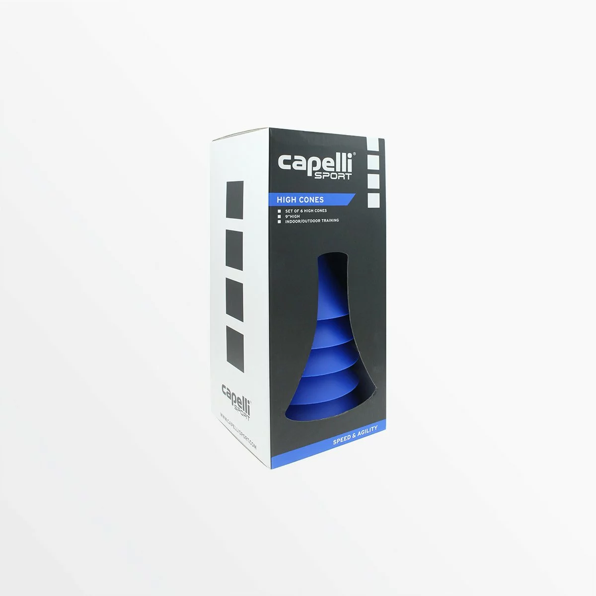The multifunctional High Cones can be used as field markers or to set up agility and speed drills. The set of six cones are made out of durable plastic and colored a bright royal blue for high visibility at all times of the day and weather conditions. Â