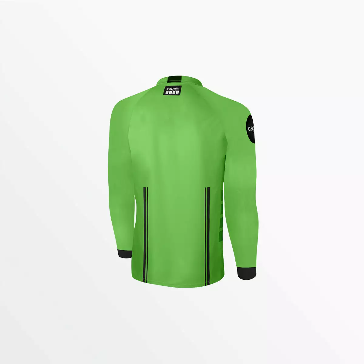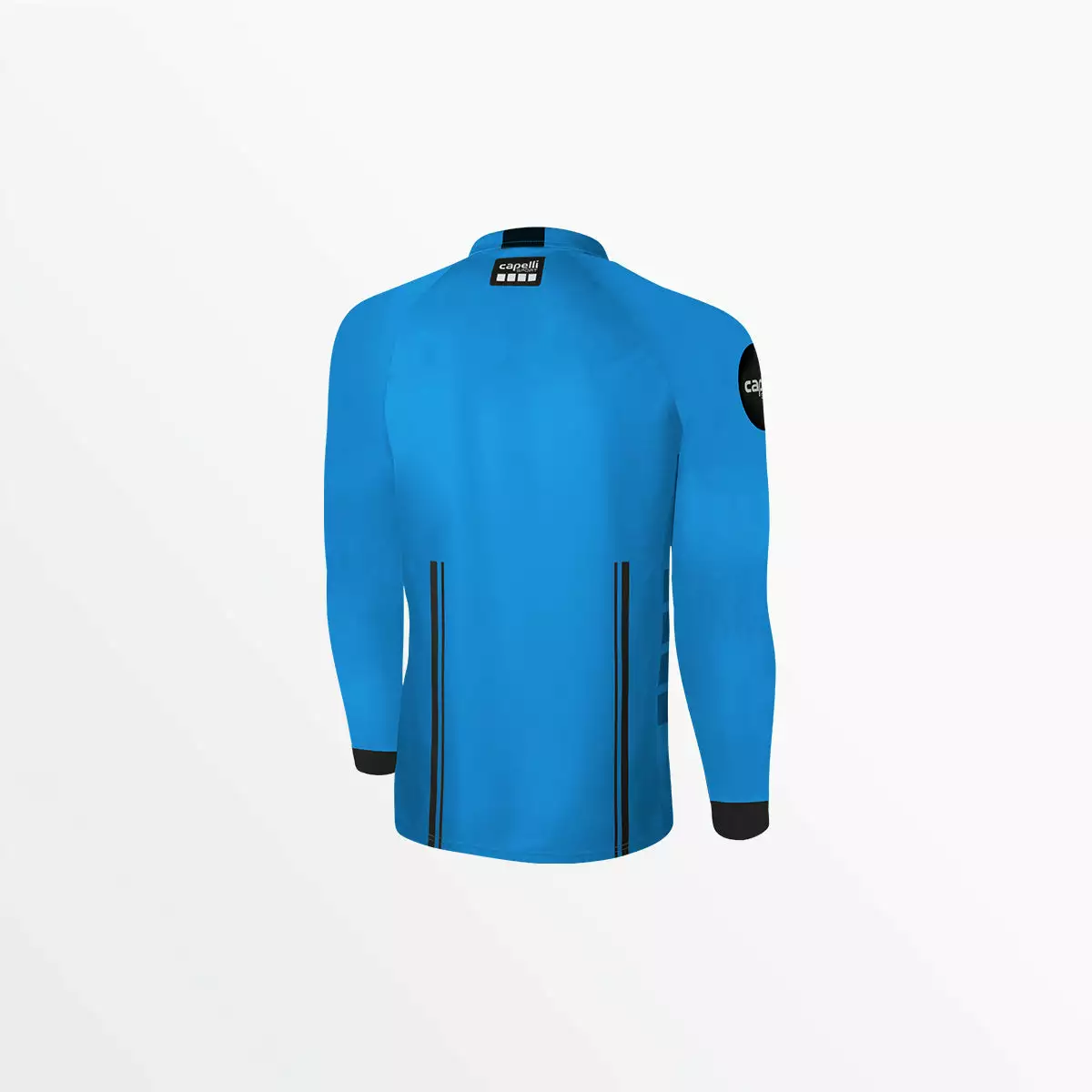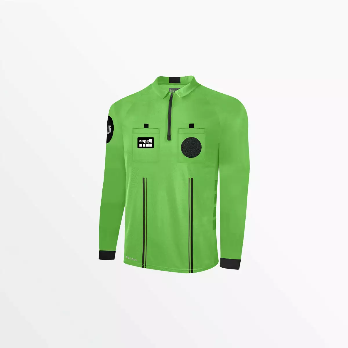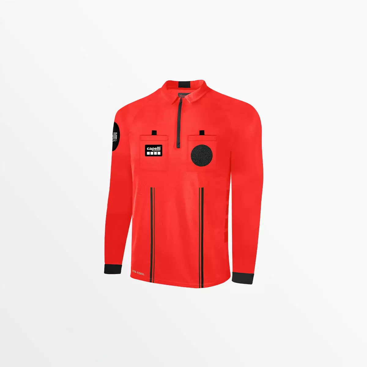 The Capelli Sport Official Referee 1/4 Zip Long Sleeve Jersey is the approved design for youth and amateur games all around the country. Interlock fabric provides durability with black pinstripes to set you apart on the field. Two front chest pockets give you storage and easy access to your essential items with velcro closures for security. The jersey is completed with sublimated logos on the pockets and sleeve.