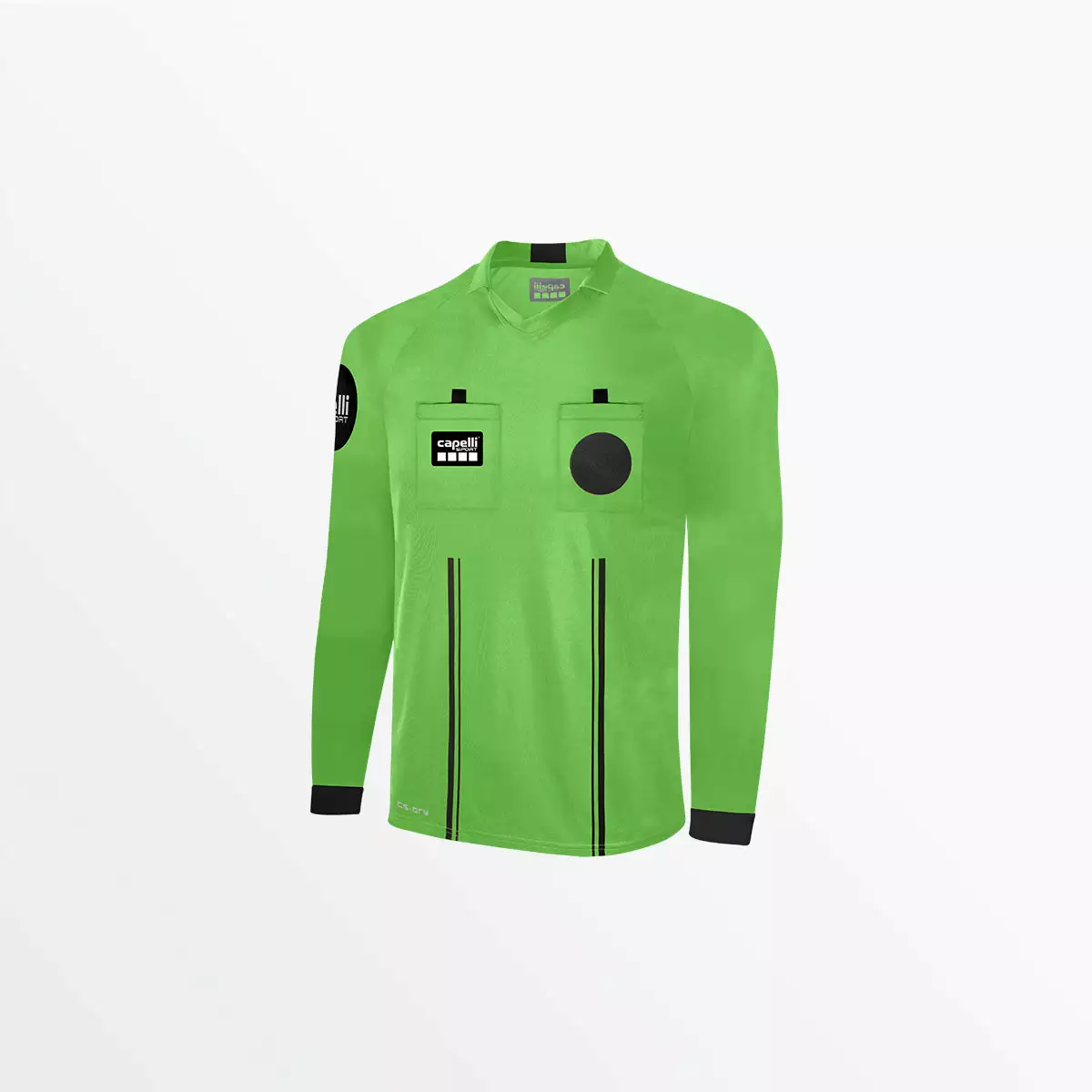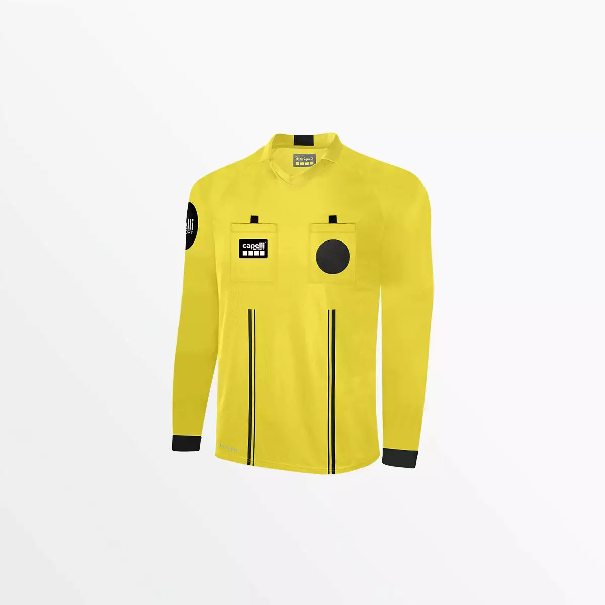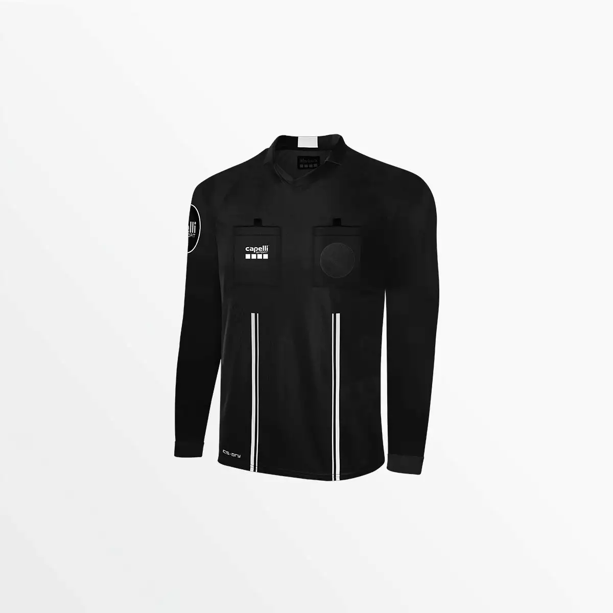 The Capelli Sport Official Referee V-Neck Long Sleeve Jersey is the approved design for youth and amateur games all around the country. Interlock fabric provides durability with black pinstripes to set you apart on the field. Two front chest pockets give you storage and easy access to your essential items with velcro closures for security. The jersey is completed with sublimated logos on the pockets and sleeve.