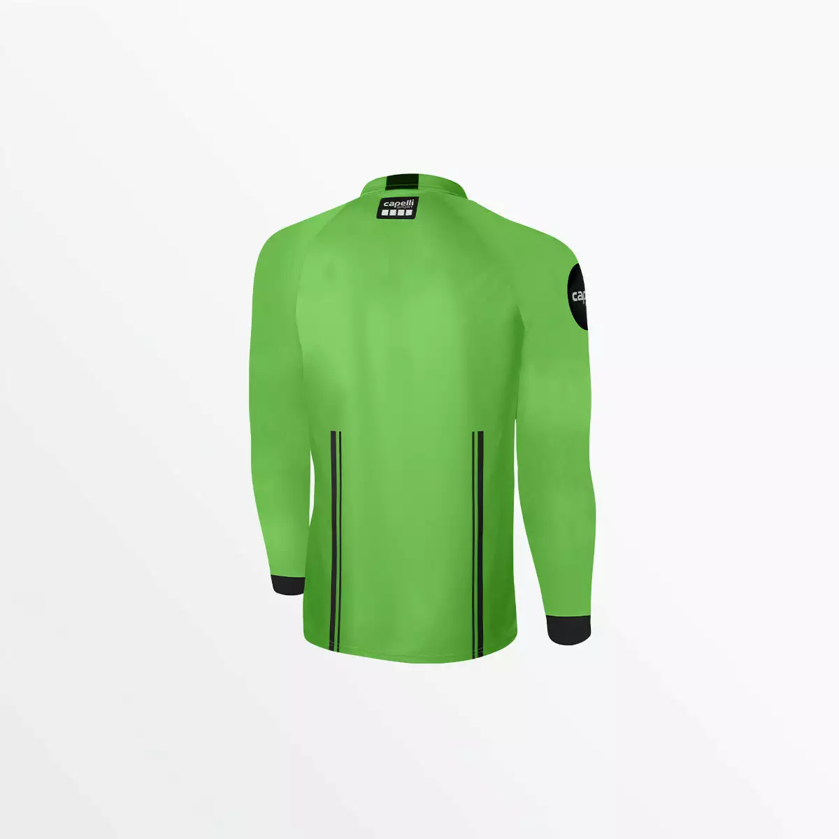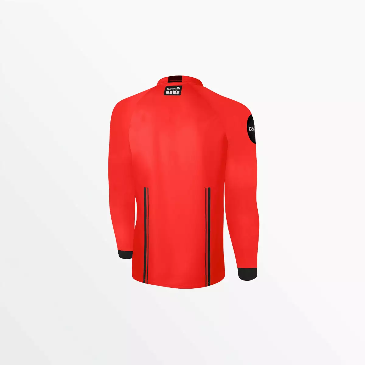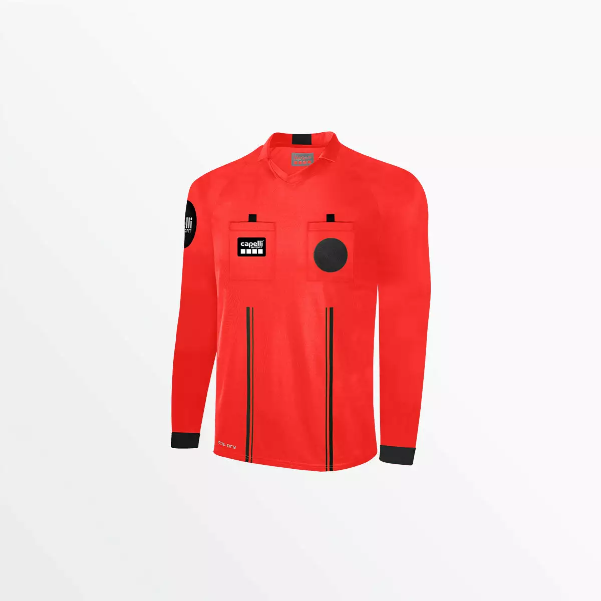 The Capelli Sport Official Referee V-Neck Long Sleeve Jersey is the approved design for youth and amateur games all around the country. Interlock fabric provides durability with black pinstripes to set you apart on the field. Two front chest pockets give you storage and easy access to your essential items with velcro closures for security. The jersey is completed with sublimated logos on the pockets and sleeve.