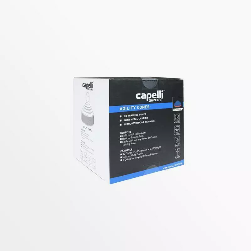 A pack of 30 flexible training cones in 3 colors stacked nicely on a metal carrier for easy collection and transportation.