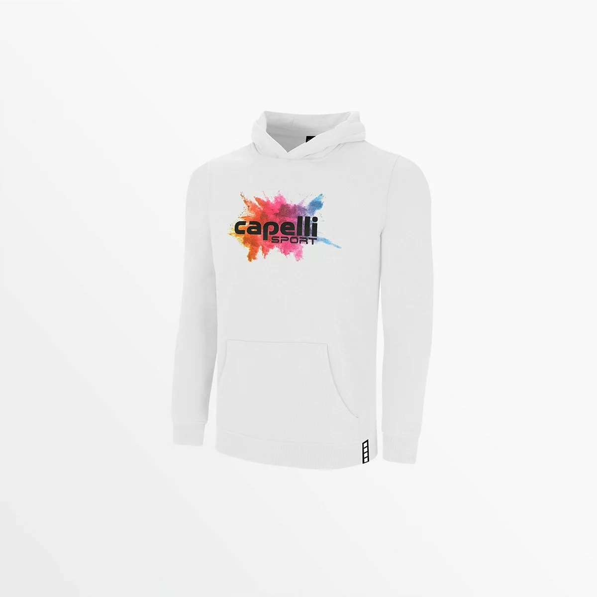 This bright white lifestyle hoodie features a contrasting neon explosion design to add a pop of color to any outfit. Cozy up with the soft fleece interior, kangaroo pocket and drawstring hood.