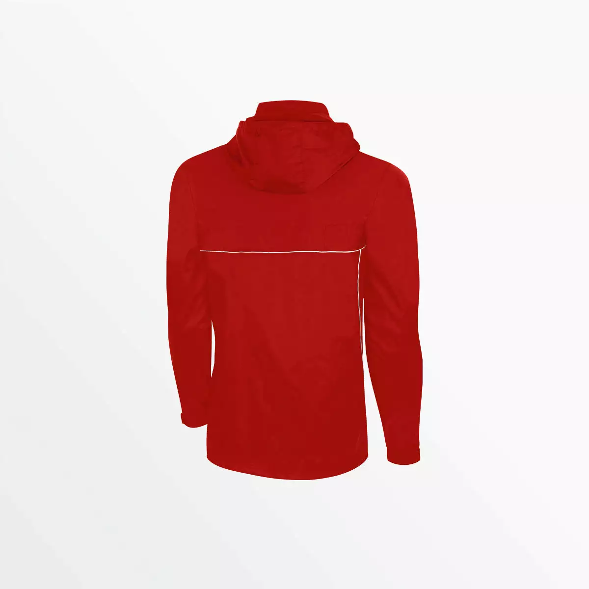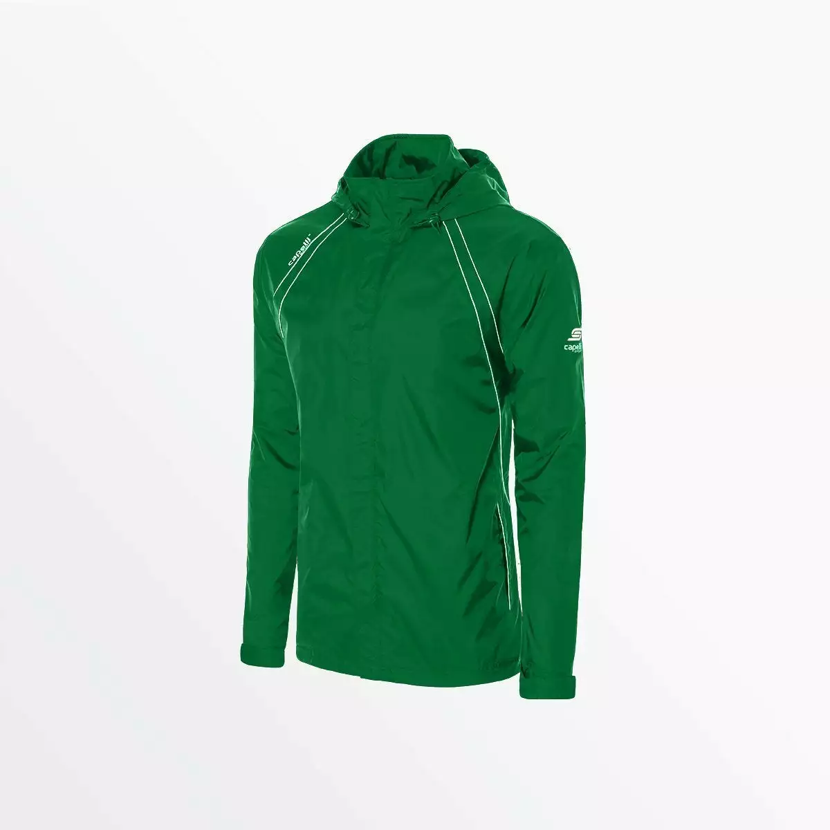 Stay dry with the Capelli Sport Raven Rain Jacket. Water resistant material, a roll up hood and bottom elastic keeps the water out, while piping details and mesh lining give you functionality without compromising style.Â